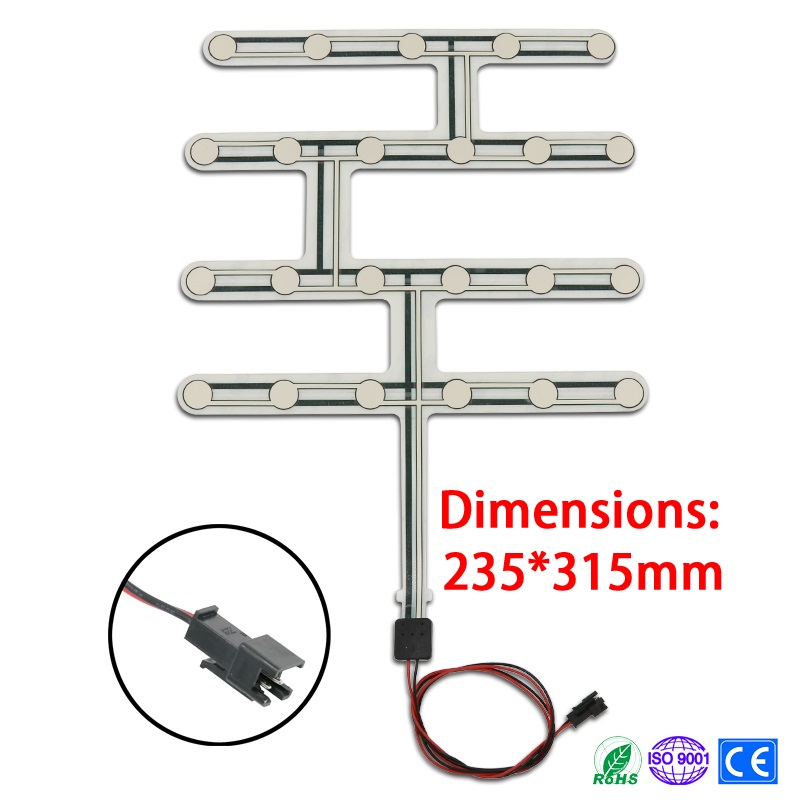 We can custom design different seat sensor shape and touch point sensitivity according to the seat's shape, rigidity and elasticity of car seat. The seat pressure sensors usually contain four layers, up circuit layer, between adhesive layer, down circuit layer and back adhesive layer. Other accessories are wire cables and connectors. |
